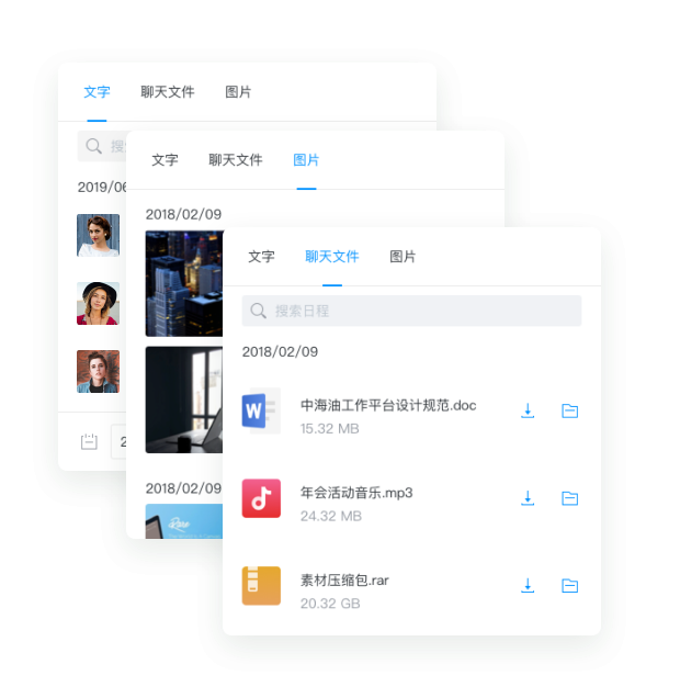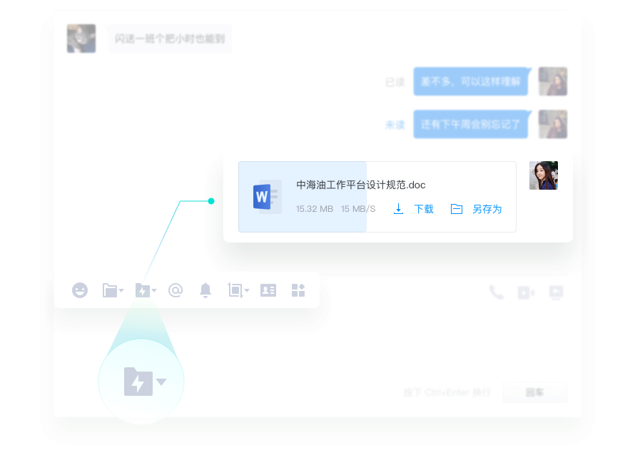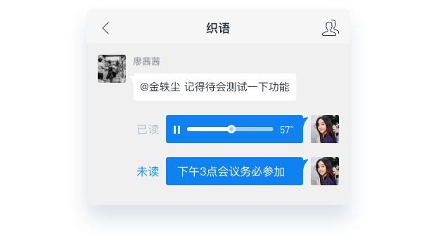 多人会话中沟通内容可引用,文件图片自动归档,方便追溯;每个群都有共享空间,方便成员互相分享