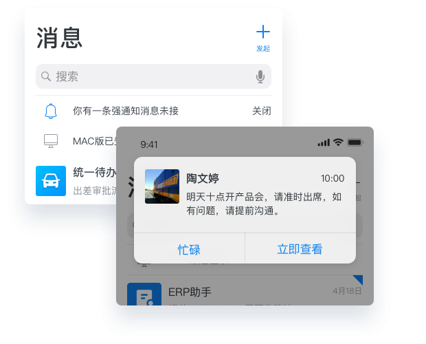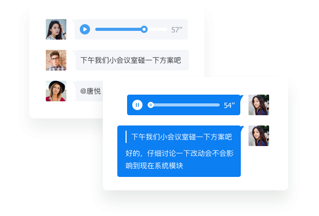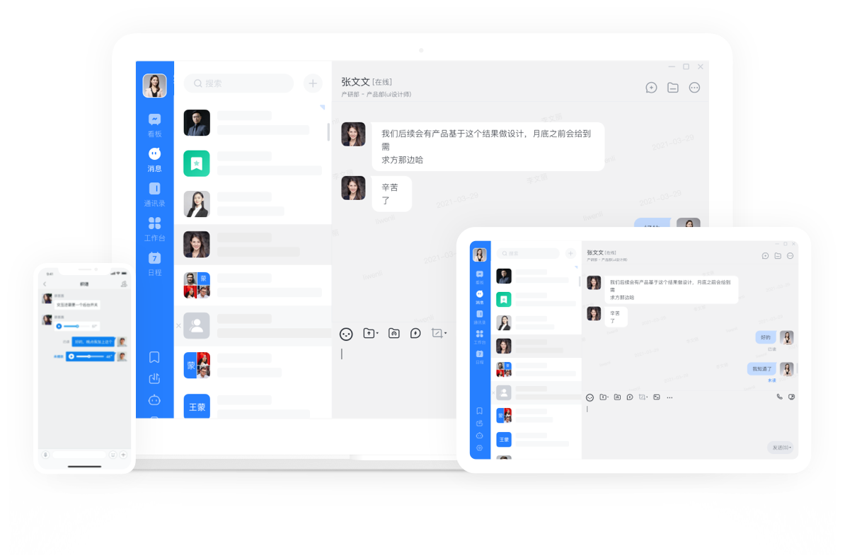 工作消息自动备份到云端,在任意时间、任意设备打开云端会,都会立刻切换到当前的工作状态,以往所有消息和文件传输也随时随地保持同步