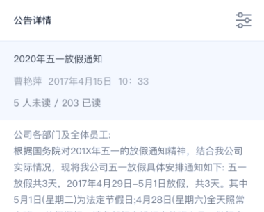 电子公告通过专门的公告应用号发布,并直接到达每个人的移动终端,保障每个人都能第一时间接收到公告信息;每个被通知人已读未读状态全显示,更可按部门统计查看未阅读人员名单,未读人员还可以进行强通知催读