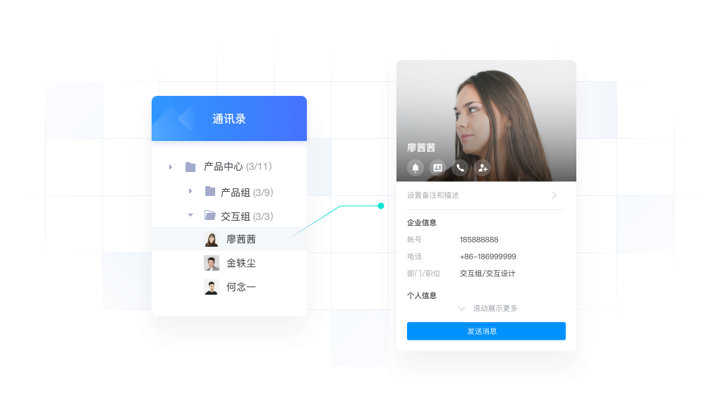 快速寻人,联系人名片更完善,再也不用记电话号码了;支持多种组织形态——各级部门、矩阵组织、临时组织、一人多职、职位排序、项目团队等等